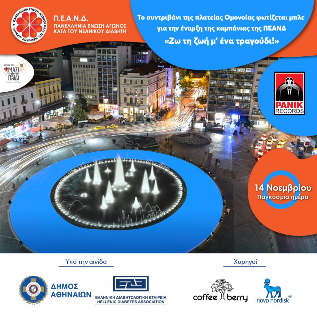 Το σιντριβάνι της πλατείας Ομονοίας φωτίζεται μπλε για την έναρξη της καμπάνιας της ΠΕΑΝΔ «Ζω τη ζωή μ’ ένα τραγούδι»