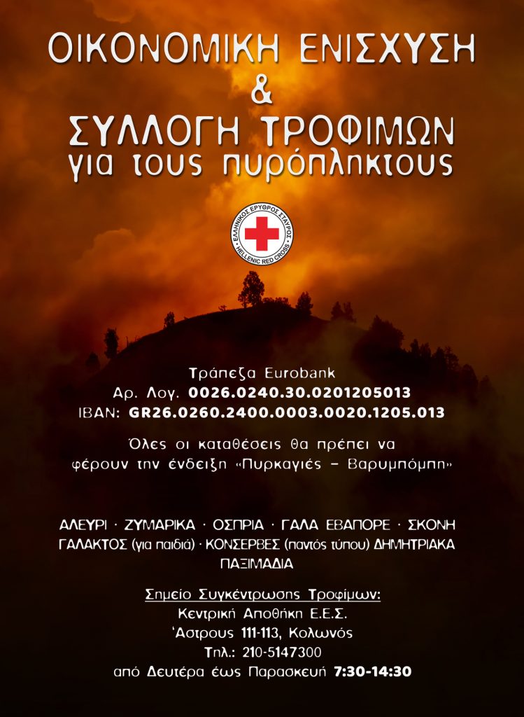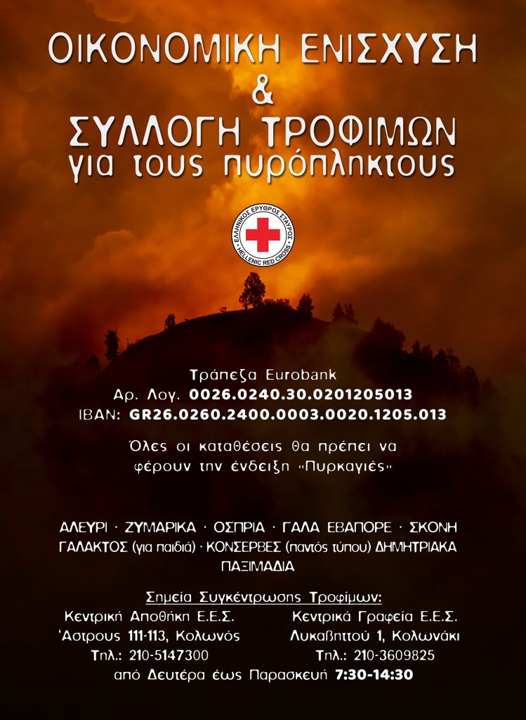 Άνοιγμα λογαριασμού και συγκέντρωση τροφίμων για τους πυρόπληκτους σε Βαρυμπόμπη Πάτρα Ρόδο Β. Εύβοια και Αρχαία Ολυμπία