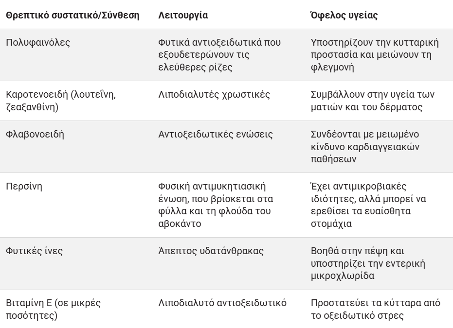 Ο παρακάτω πίνακας συνοψίζει τις κύριες ενώσεις που βρίσκονται στη φλούδα του αβοκάντο: